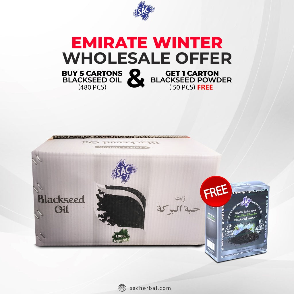 Stock up on the powerful benefits of Blackseed Oil with our wholesale package! Each carton contains 30ml bottles of this oil, totaling to 480 pcs. Plus, when you buy 5 cartons, you'll receive a free carton of our Blackseed Powder, with 50 pcs included. Don't miss out on this amazing deal!
